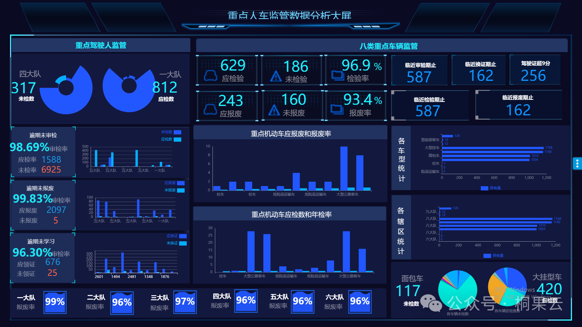 1.重点车辆监管:8类重点车隐患预警、逾期未检验/报废分析,从源头消除安全隐患。